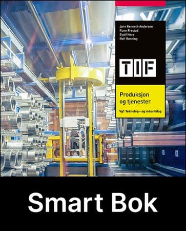 Teknologi- og industrifag, Vg1Elevene får grunnleggende kunnskap om verktøy og maskiner, teknikker og materialer som de trenger for å produsere varer og tjenester. De lærer om regelverket for helse, miljø og sikkerhet, og om betydningen av å følge reglene i arbeidet. I del 1 får elevene en innføring i produksjonsprosessen, vektlagt bærekraft og teknologisk utvikling.Boka er inndelt i 6 deler: Produksjonsprosessen, Sponfraskillende bearbeiding, Sammenføyning, Materiallære, Montering, vedlikehold og reparasjoner og Maskinelementer.Innledningsvis er det temasider som gir elevene en innføring i viktige tverrfaglige temaer for alle 3 programfag.Boka Produksjon og tjenester er skrevet for felles programfag Produksjon og tjenester for Vg1 Teknologi- og industrifag, og er en av tre bøker i TIF-serien.Dette får du i Smart Bok – den digitale utgaven av Gyldendals kjente lærebøker Denne utgaven har syntetisk tale. Kan ta notater, markere tekst og lage bokmerker.Søke etter innhold.Kan brukes i nettlesere på de fleste enheter online.Kan kobles direkte på projektor og interaktive tavler.